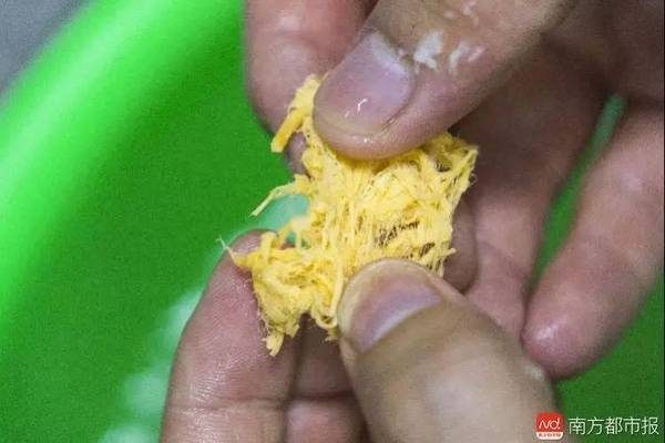 吴工拧干并拉扯这团肉松,稍有韧性的湿肉松需要微微用力才能扯开,扯开后呈一条条较长丝状。“这应该是鸡肉松。市场上的肉松一般分为鸡肉松和猪肉松,鸡肉松的纤维较长,而猪肉松相对更短更碎”。