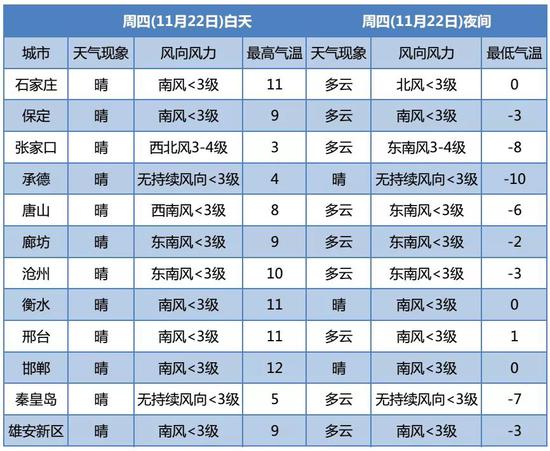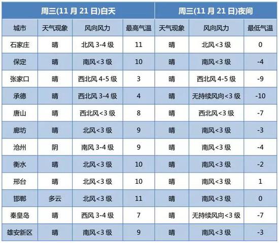 21日,河北大部地区最低气温变幅不大,北部地区设区市(张家口、承德、唐山、秦皇岛)最低气温为-8℃至-4℃,中南部地区各设区市为-2℃至3℃;