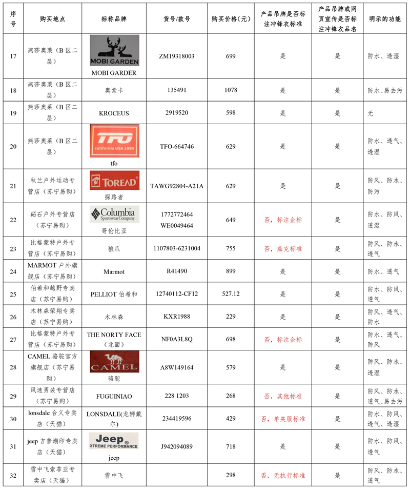 50件样品中,有18件样品明示功能和实测不相符,涉嫌虚假宣传。在18件功能性名不副实的样品当中,有4件样品网页宣传为冲锋衣,实际样品却明示其他服装品名,也未执行冲锋衣标准。具体如下图↓↓↓
