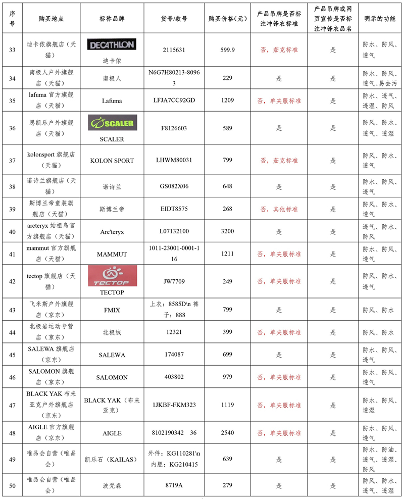 据悉,本次比较试验样品从电商平台及实体店随机购买,其中电商平台购买30件,实体店购买20件,共50件。购买价格从229元到3200元不等。比较试验购买的样品主要是冲锋衣或类似产品。经统计,50件样品中明示品名或在电商的产品页面上标注了冲锋衣名称的产品共计37件,明示执行冲锋衣标准的样品22件,仅明示具有功能性的样品11件。具体如下: